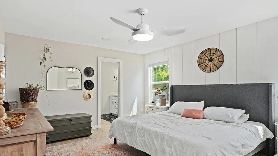 In the bedroom, the fan's overhead light creates a soft, general glow. But you probably don't want the whole room lit up when you’re reading in bed. A pair of bedside lamps offers a focused, gentle light, creating a cozy and practical setup for winding down.