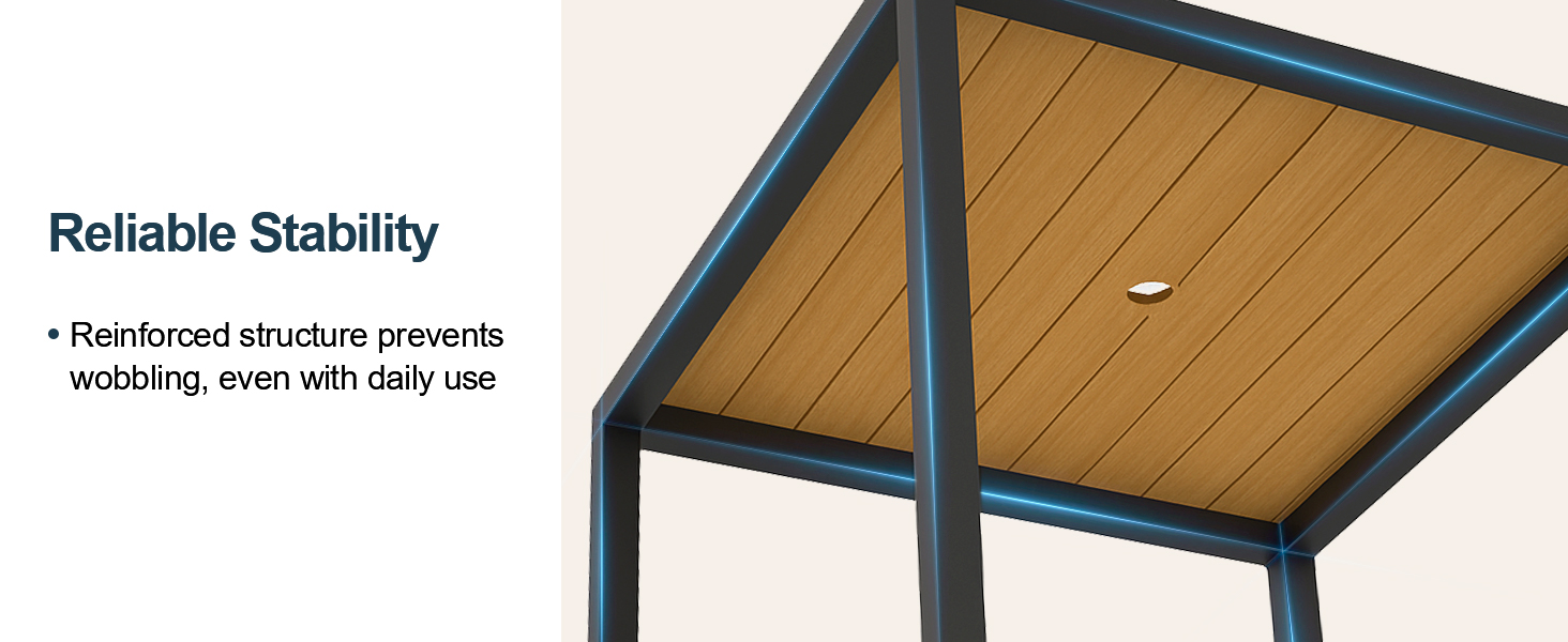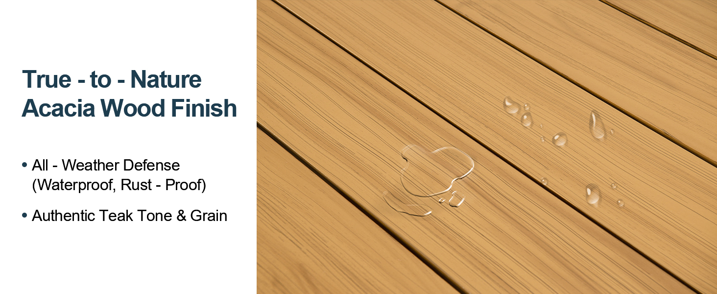 Acacia Wood Tabletop: Features a solid acacia wood tabletop with a 1.5-inch umbrella hole, offering enduring elegance and convenient shade for outdoor dining.