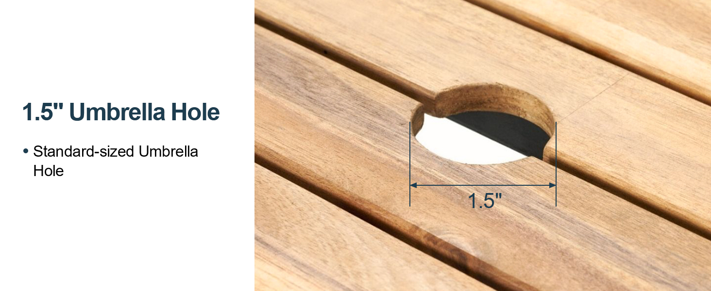 Spacious Acacia Table: Features a 59" x 35" solid acacia wood tabletop with a convenient umbrella hole, perfect for shaded al fresco dining.